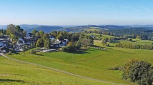 Eine hügelige Region in Nordrhein-Westfalen mit dichten Wäldern, Seen und malerischen Dörfern.